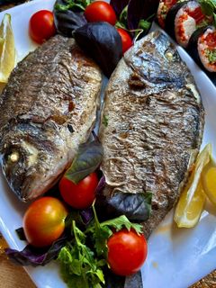 Інгредієнти · Дорадо (0.5 кг) 2 шт · Помідори 2 шт · Часник 1 зубчик · Оливкова олія 70 мл · Цибуля 1 шт · Спеції: морська сіль, перець чорний і …