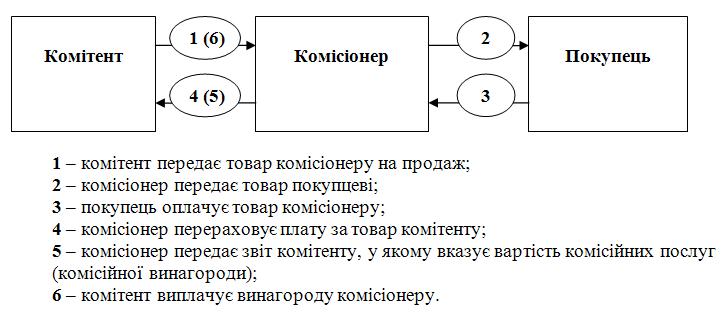 комісіонер – одна сторона, яка за дорученням іншої та за її оплату бере на себе обов'язки провести правочин (чи декілька) від власного імені; комітент – інша сторона, за рахунок якої здійснюється цей правочин.