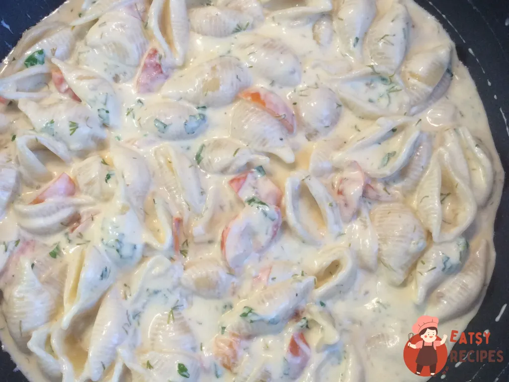 Макарони – 500 г. Помідори – 3 штуки. Рублена петрушка – 20 г. Вершки – 100 г. Вершкове масло – 50 г. Харчова цінність. Калорії. 657. Протеїни. 22. Жири. 23.