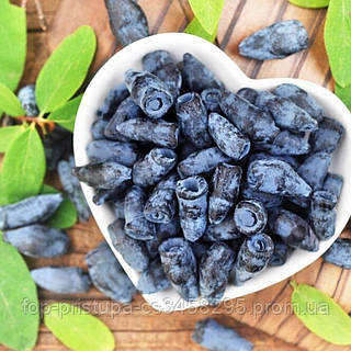 Ягоди – за кольором схожі на лохину, темно сині з легким восковим нальотом, видовженої, витягнутої форми від 1,5 см до 3 см, збалансованого кисло-солодкого смаку. У плодоношення саджанці жимолості вступають швидко. Перші ягоди ви зможете спробувати вже за рік після посадки саджанців.