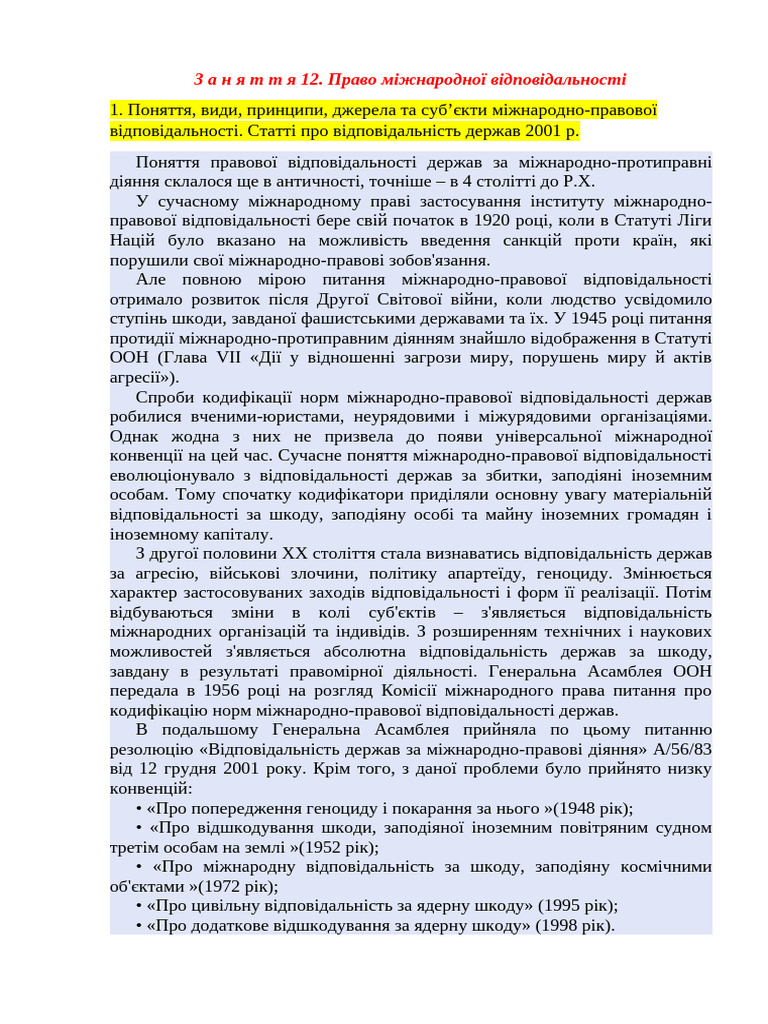 Міжнародно-правова відповідальність – це юридичні відносини, що виникають у МП у зв'язку з правопорушенням, вчиненим державою або іншим суб'єктом МП, або у зв'язку із шкодою, завданою одним суб'єктом іншому в результаті правомірної діяльності.