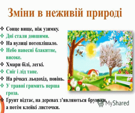 Весна відмикає дерева й води. Березень березовим віником зиму вимітає, а весну в гості запрошує. Назвіть весняні місяці. Які зміни відбуваються в неживій приро …