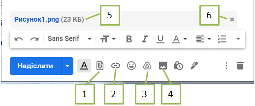 До електронного листа можуть бути вкладені файли різних типів: малюнки, фотографії, презентації та інші файли.